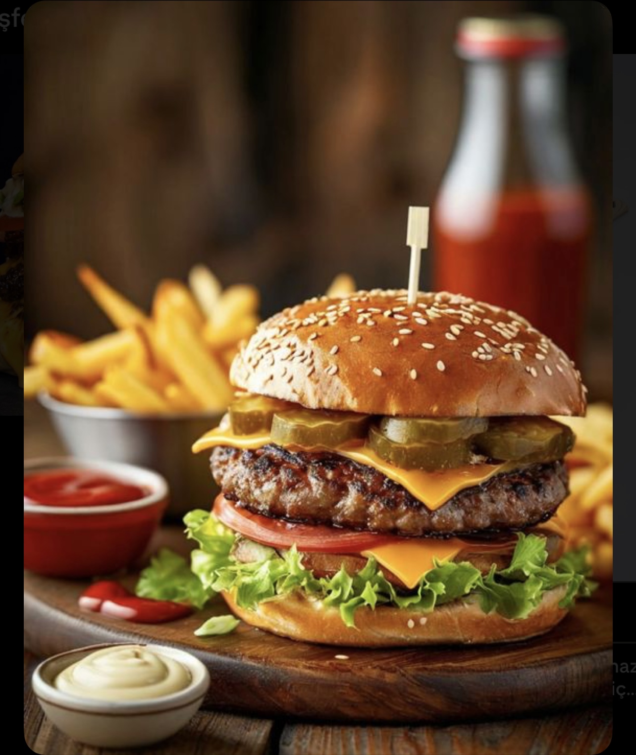 120gr dana eti , Cheddar Peyniri, Turşu, domates, marul, patates kızartması,