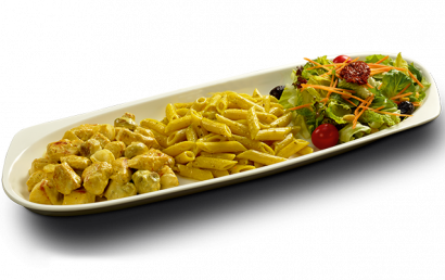 Tavuk, mantar, köri, makarna ve mevsim salata